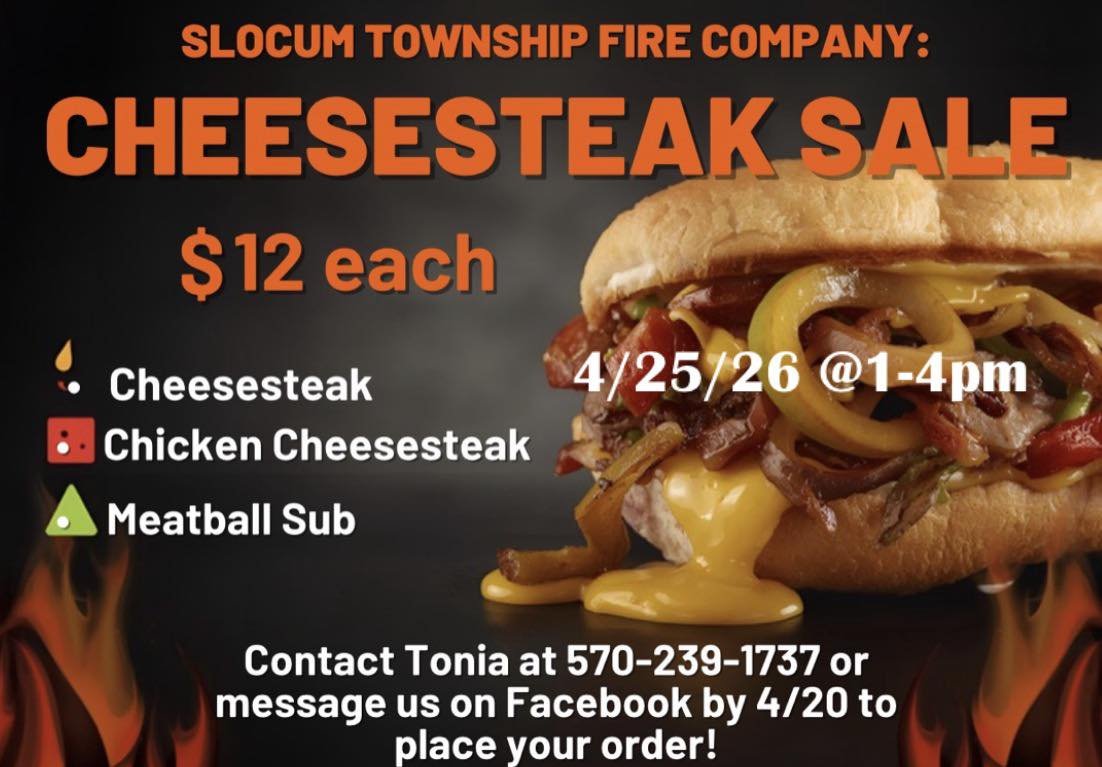 Support the Slocum Township Volunteer Fire Company by joining us for our Cheesesteak Sale. We’ll be offering a delicious selection of hot sandwiches, all prepared fresh and ready for pickup.